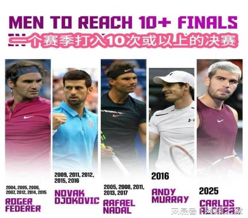 盤點(diǎn)本世紀(jì)球員表現(xiàn),共有5位男選手在一個(gè)賽季打進(jìn)10+決賽。除了阿卡外,其余四人不是他人,正是費(fèi)納德穆四巨頭。