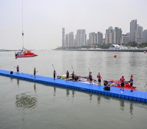 摩托艇被吊入比賽起點(diǎn)處。澎湃新聞?dòng)浾?朱偉輝 圖