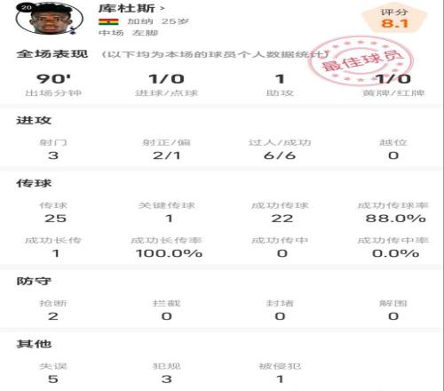 庫杜斯vs利茲聯(lián)全場數(shù)據(jù):貢獻1球1助,6次過人全部成功