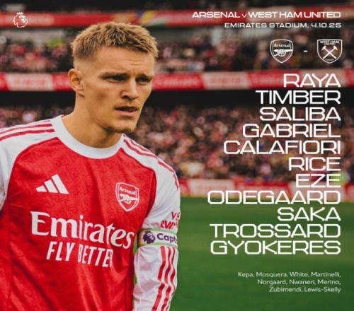 槍手戰(zhàn)西漢姆:厄德高、埃澤齊首發(fā)