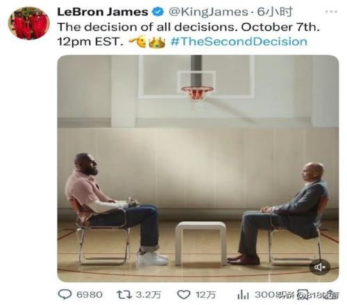 10月7日凌晨,湖人老大詹姆斯突然更新了推特動(dòng)態(tài),他寫道:“所有決定中的決定,10月7日,美東時(shí)間中午12點(diǎn)。#決定2”換算成北京時(shí)間即明天凌晨0點(diǎn)。