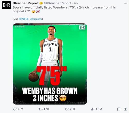 北京時間10月9日,美國媒體BR寫道:馬刺官方公布文班亞馬身高為7尺5英寸(約2.26米),比原先的7尺3英寸(約2.21米)增加了2英寸。