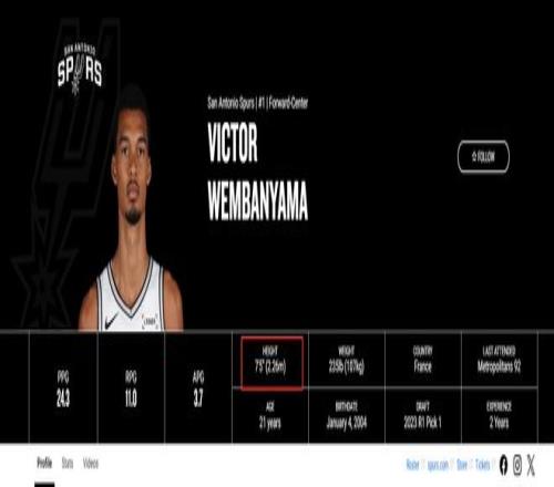 我剛剛真的去看了NBA官網,文班亞馬的身高的確已經更新為7尺5(2.26米),他已經是跟姚明一樣身高的超級長人了,不過他的體重是235磅(約107公斤),這比馬刺媒體日給出的240磅少了5磅。