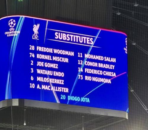 雷速體育10月23日宣 歐冠聯(lián)賽階段第三輪,利物浦客場(chǎng)挑戰(zhàn)法蘭克福。半場(chǎng)結(jié)束利物浦3-1領(lǐng)先法蘭克福。比賽中出現(xiàn)暖心一幕,法蘭克福主場(chǎng)的大屏幕顯示利物浦替補(bǔ)球員時(shí),加入了今夏不幸離世的若塔的名字。
